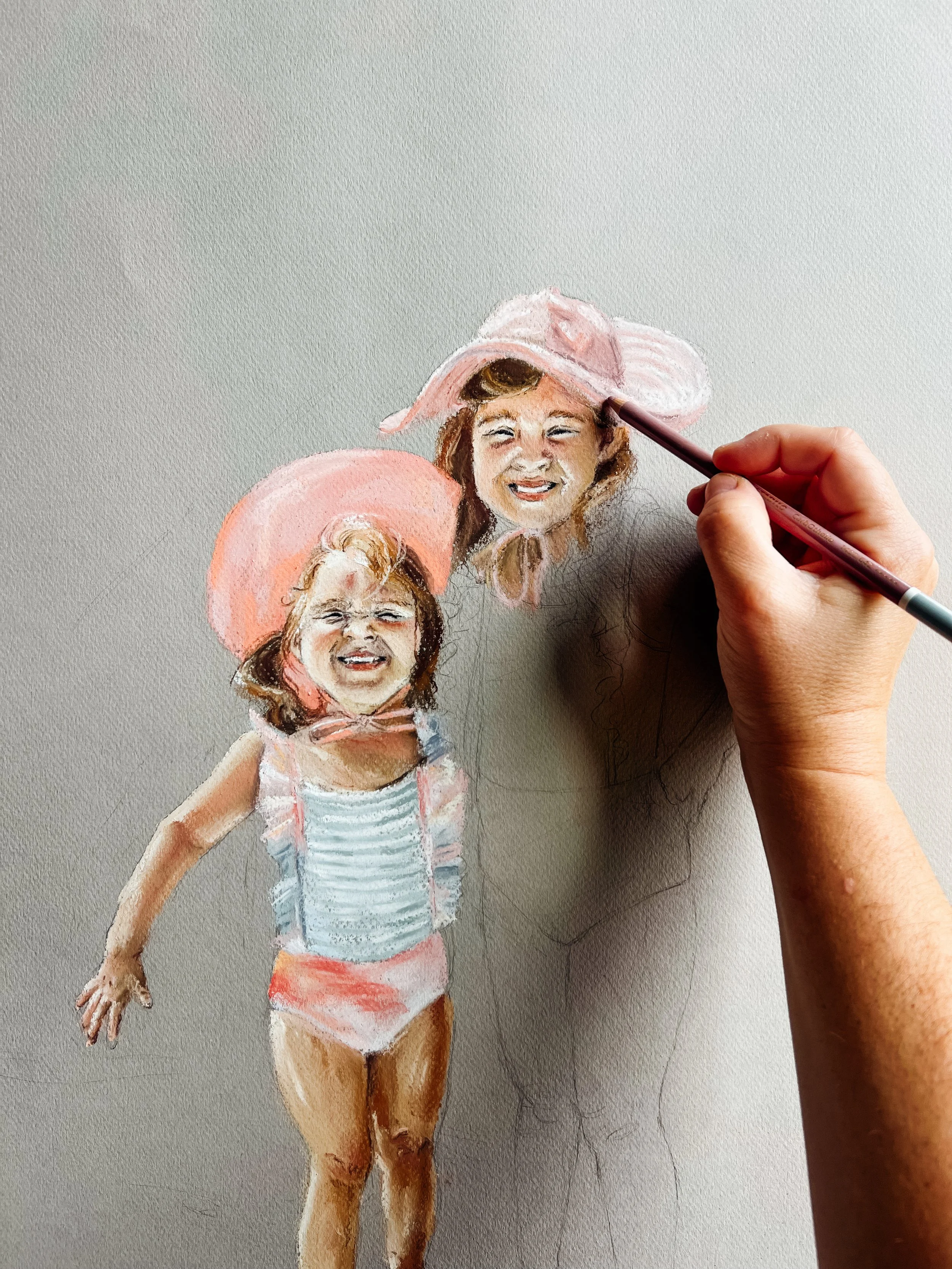 This blog post is about creating the Gould pastel portrait! It shows some behind the scenes photos of the sketching process and how the process of pastel portraits works start to finish. This piece features two sisters at the beach on family vacation - so cute!